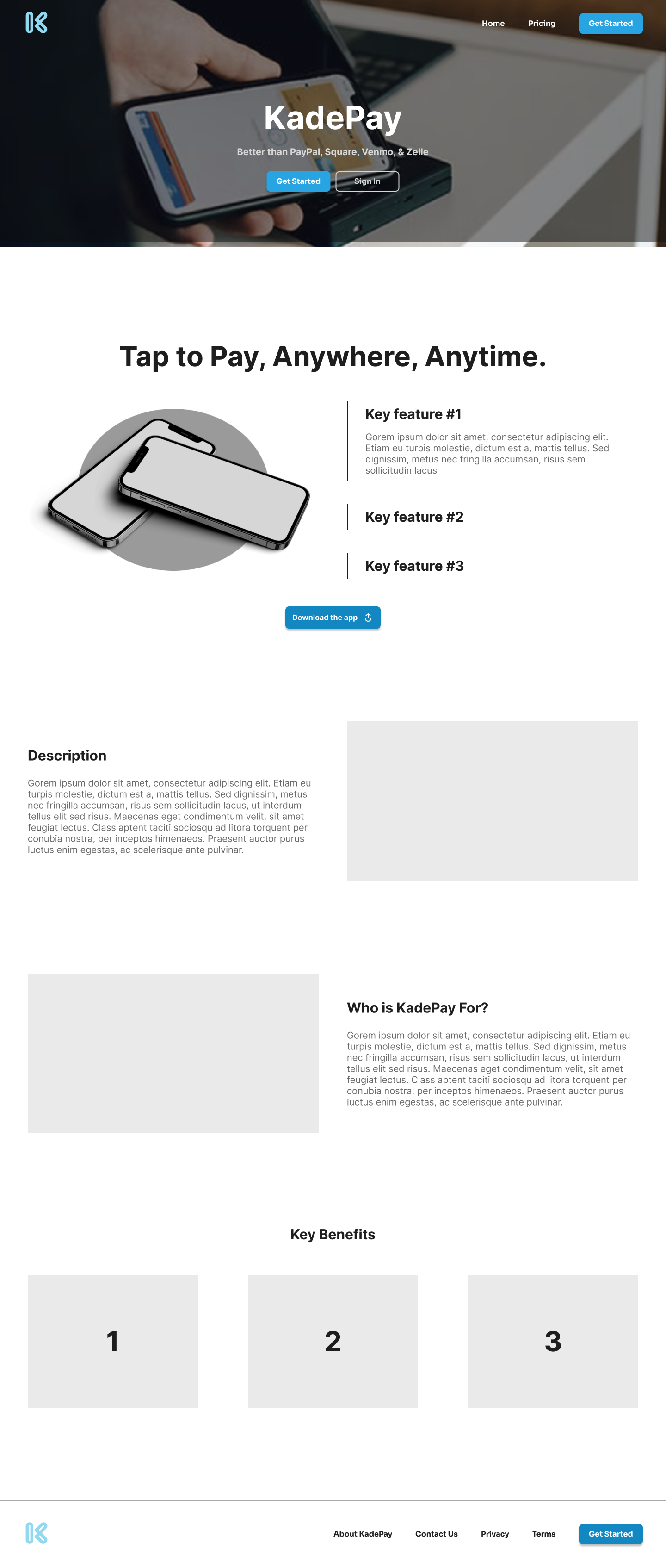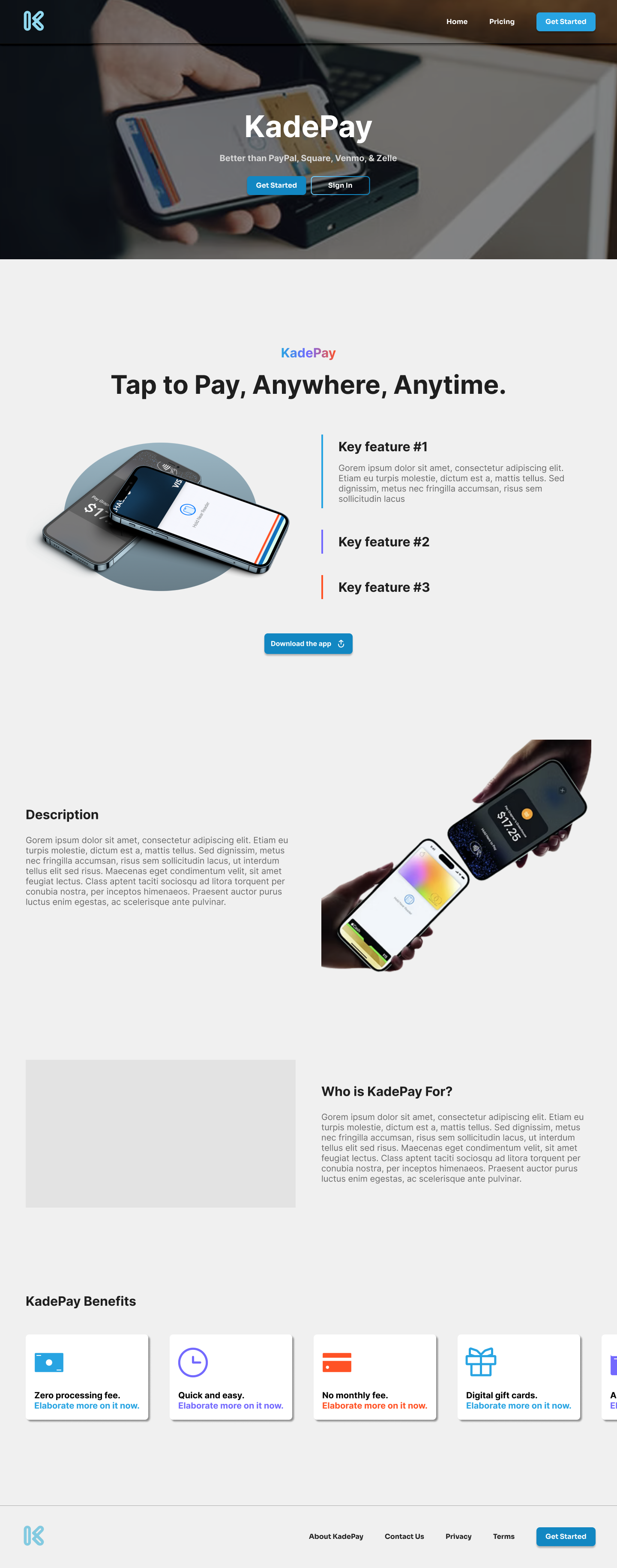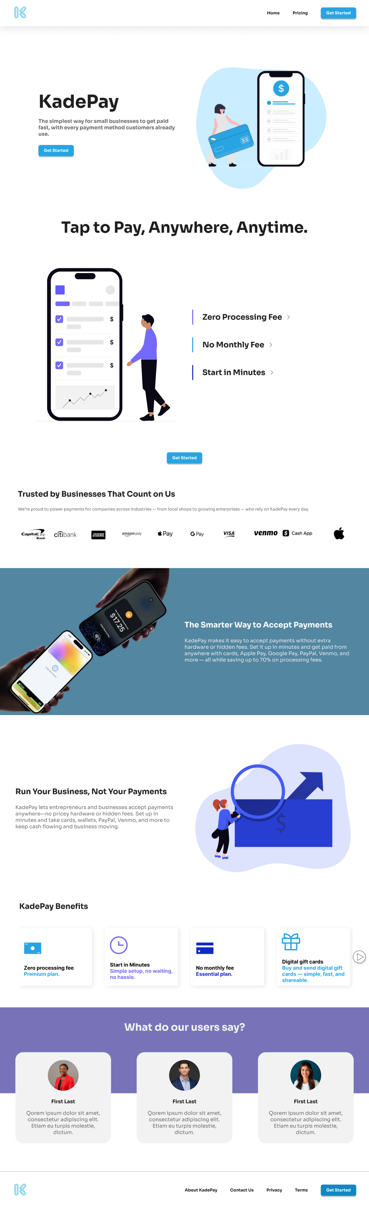 This project is still a work in progress, and I continue to test, gather feedback, and refine the design. Future iterations will focus on strengthening visual consistency, adding real customer testimonials, and validating design choices through usability testing to ensure the final product best supports KadePay’s users.