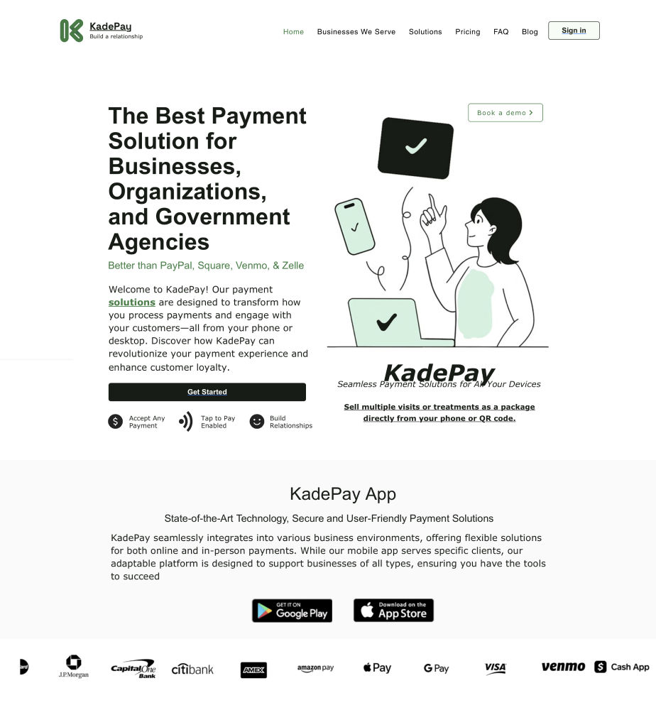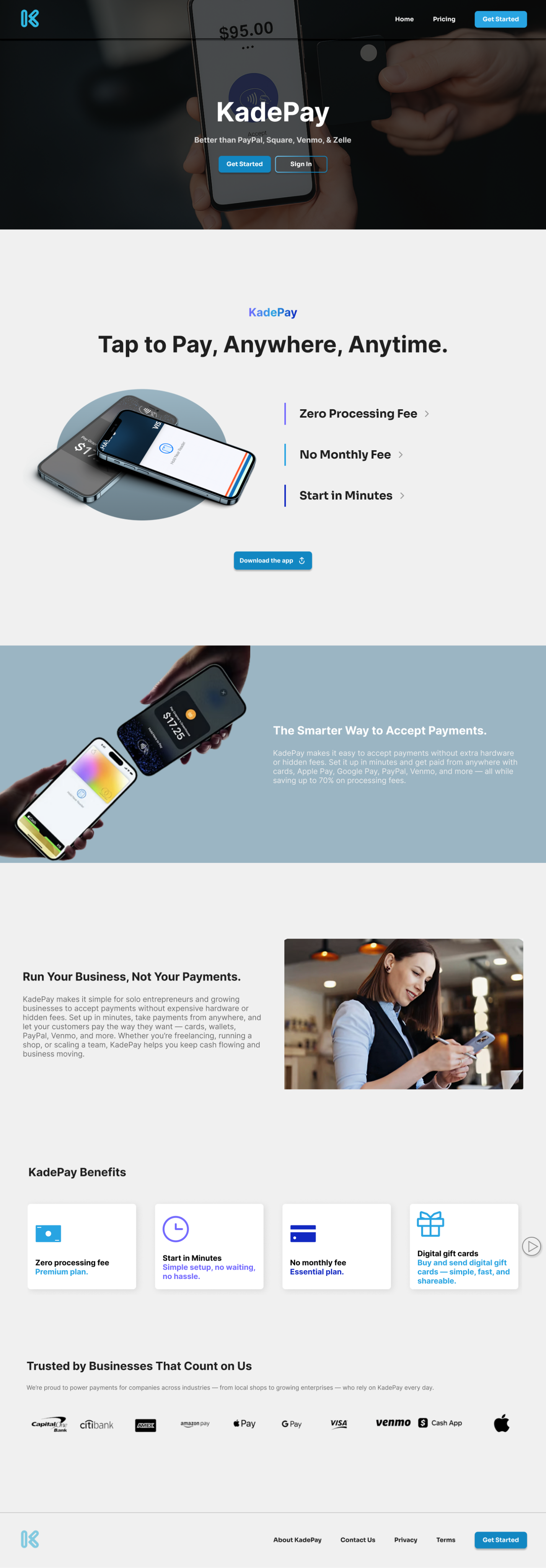 The redesigned KadePay website is shaping up to be cleaner, more focused, and more user-friendly. Early iterations show strong improvements in narrowing the messaging to small businesses, simplifying the layout, and unifying the call-to-action to reduce friction in the user journey. Accessibility refinements and a more polished visual system are helping the site communicate its value with greater clarity and professionalism.